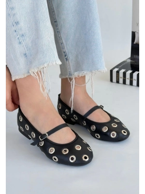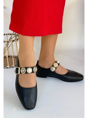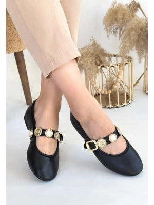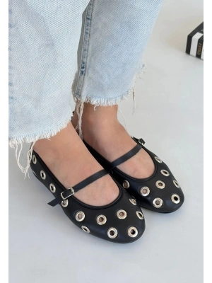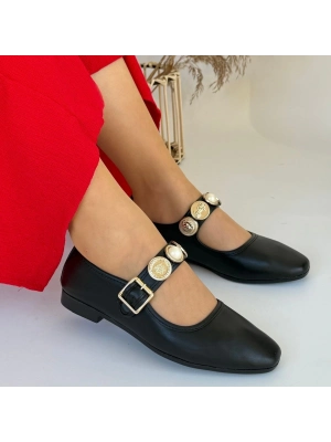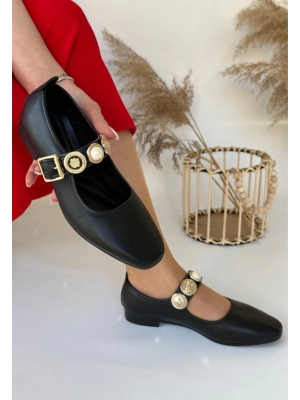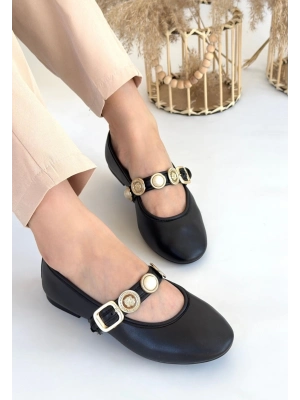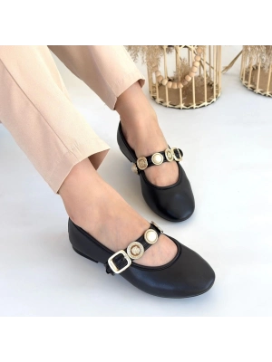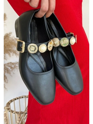 Hante Siyah Beyaz Keten Taşlı Babet Ayakkabı - Bamido