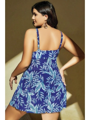 Büyük Beden Mavi Üstüne Yaprak Desenli Yırtmaçlı Gecelik