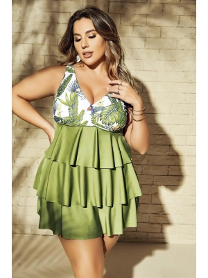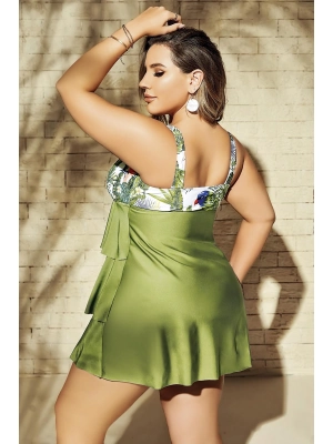 Büyük Beden Yeşil Fırfırlı Yaprak Desenli Kalın Askılı Gecelik