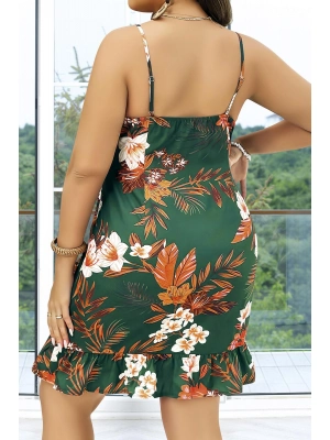 Büyük Beden Yeşil Üstüne Çiçek Desenli İnce Askılı Fırfırlı Gecelik