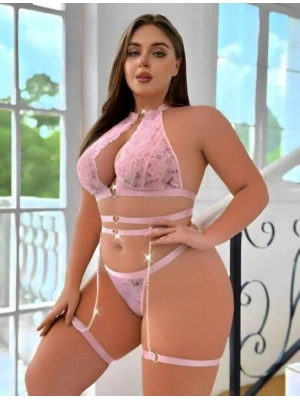 Büyük Beden Pembe Dantel İşlemeli Jartiyer Takımı
