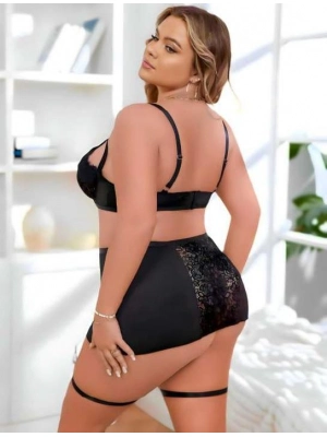 Büyük Beden Siyah Dantel İşlemeli Dekolteli Jartiyer Takımı