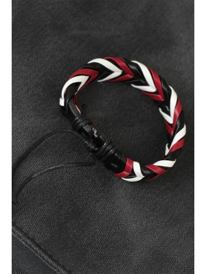 Bordo Beyaz Siyah Örgü Deri Erkek Bileklik - Bamido