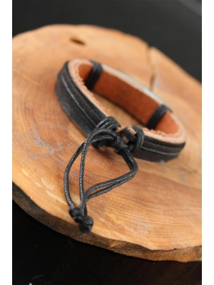 Çelik Aksesuarlı Siyah Renk Deri Erkek Bileklik - Bamido