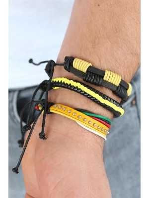 Sarı Renk Zımbalı Deri Erkek Bileklik Kombini - Bamido