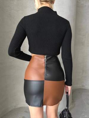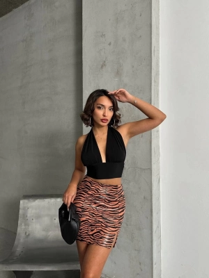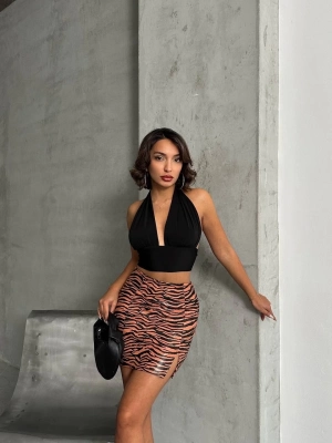 Tek Yırtmaçlı Zebra Desenli Deri Etek Kahvesiyah W24475-s