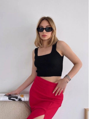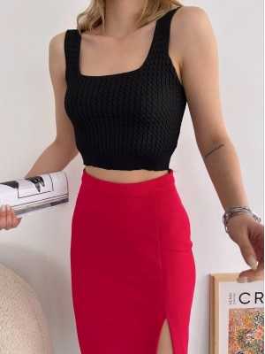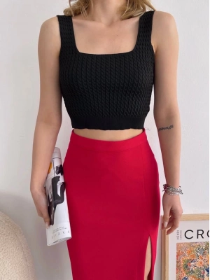 Yırtmaçlı Esnek Kumaş Midi Boy Etek Koyu Kırmızı