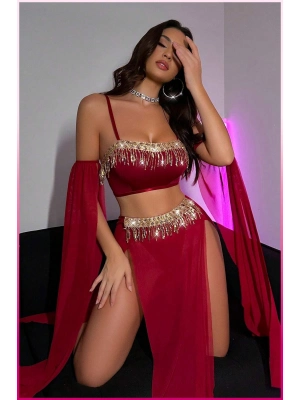 Bordo Pul Aksesuarlı Tül Etekli Kadın Seksi Gecelik