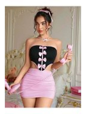 Kadın Pembe Ekose Etekli Seksi Kostüm