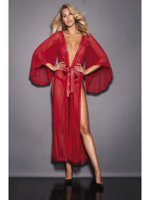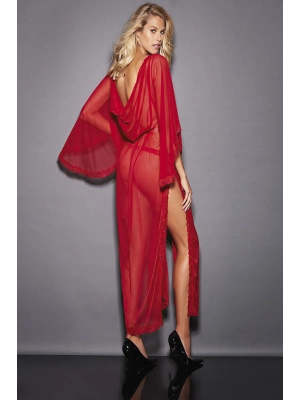 Kırmızı Dantel İşlemeli Yırtmaçlı Tül Uzun Fantezi Gecelik