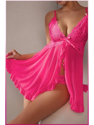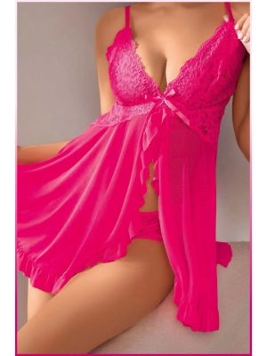 Kadın Seksi Fuşya Tül Gecelik Ve Külot Takım
