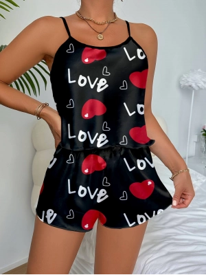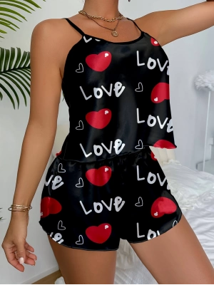 Bamido Aşk Temalı Kalp Desenli Siyah Saten Şortlu Gecelik Takım
