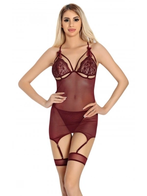 Transparan Bordo Dantel İşlemeli Sütyenli Jartiyer Takımı