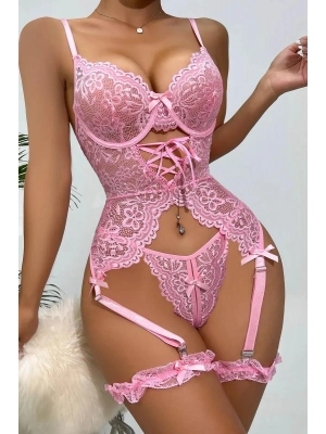 Pembe Çiçek Desen Fırfırlı Fantezi Jartiyer Takım