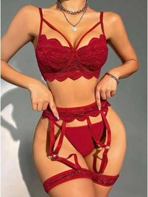 Bordo Dantel İşlemeli Göğüs İp Detaylı Fantezi Jartiyer Takımı