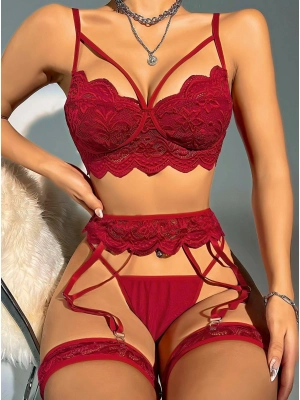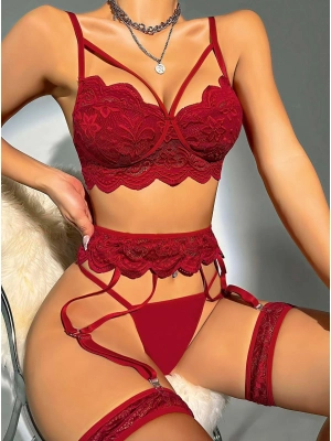 Kırmızı Dantel İşlemeli Göğüs İp Detaylı Fantezi Jartiyer Takımı