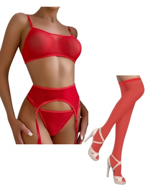 Fantazi Kırmızı Seksi Transparan Tül Jartiyer Takım