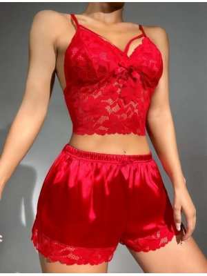 Kırmızı Dantel Detaylı İnce Askılı Saten Şortlu Takım