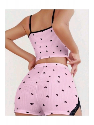 Pembe Kalp Desenli Askılı Şortlu Pijama Takım