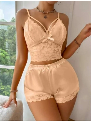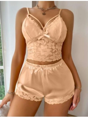 Mercan Dantel İşlemeli İnce Askılı Saten Şortlu Takım