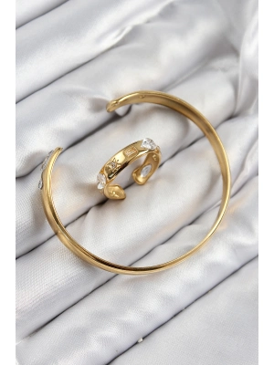Pirinç Zirkon Taşlı Ayrık Model Gold Renk Bileklik Yüzük Set - Bamido
