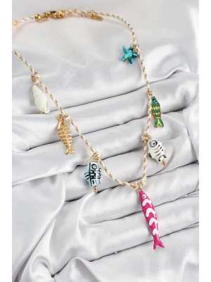 Seramik Motifli Pembe Balık Figürlü Model Krem İp Kadın Kolye - Bamido