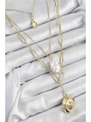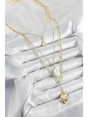 Pirinç Çoklu Zincirli İncili Deniz Kabuğu Model Gold Renk Kadın Kolye - Bamido