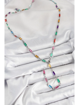 Pirinç Renkli Zirkon Taşlı Dikdörtgen Model Gümüş Renk Kadın Y Kolye - Bamido
