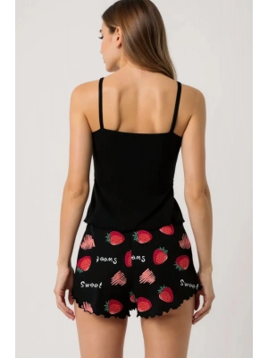 Çilek Baskılı Siyah Askılı Şortlu Pijama Takımı