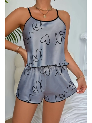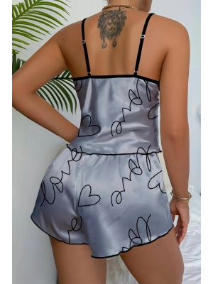 Love Baskılı Gri Saten Şortlu Gecelik Takım