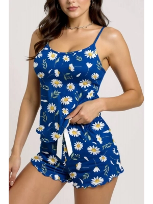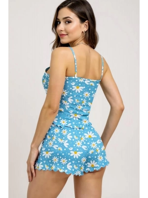 Papatya Baskılı Mavi Askılı Şortlu Pijama Takımı