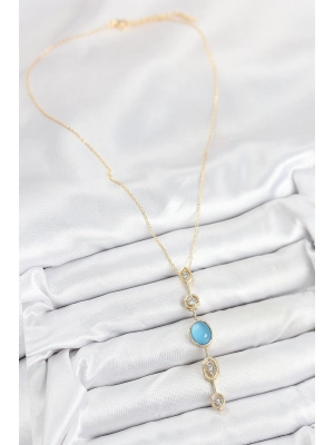 Pirinç Zincir Mavi Gold Renk Zirkon Taşlı Y Kolye - Bamido