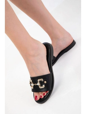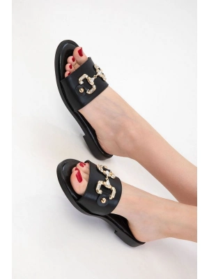 Toha Siyah Cilt Tokalı Terlik - Bamido