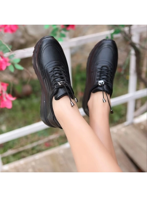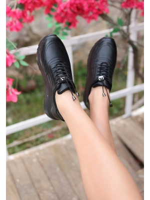 Romy Siyah Cilt Bağcıklı Spor Ayakkabı - Bamido