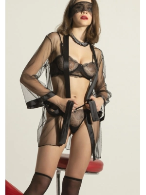 Siyah Transparan Tül Sabahlık Ve Jartiyerli Fantazi İç Giyim Seti 5'li,seksi Dantelli Gecelik Takımı