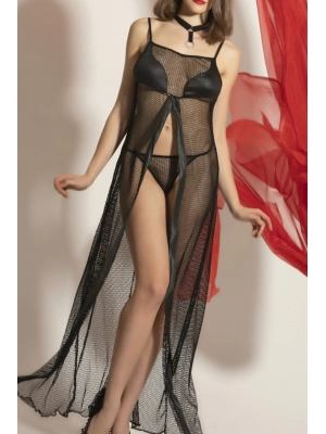 Transparan Fileli Uzun Babydoll Takım,dantel Detaylı Gecelik,tanga,boyunluk 3'lü Set