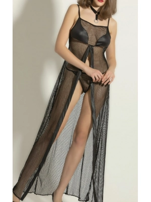 Fantazi Kadın Kostümü, Transparan File Üst, Deri Etekli Takım Ve Çorap, Kadın Gecelik