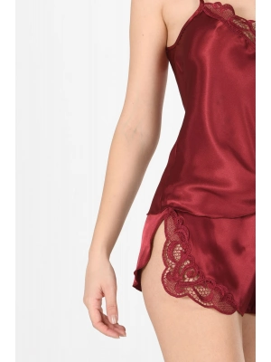 Bordo Saten Dantelli Babydoll Şortlu Takım - 288