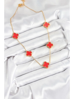 316l Çelik Zincir Gold Kırmızı Renk Yonca Kadın Kolye - Bamido