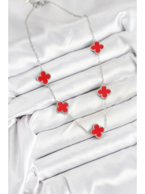 316l Çelik Zincir Gümüş Kırmızı Renk Yonca Kadın Kolye - Bamido