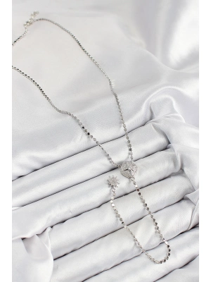 Pirinç Zirkon Taşlı Ezme Zincirli Kutup Yıldızı Model Gümüş Renk Y Kolye - Bamido