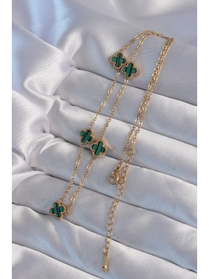 316l Çelik Gold Renk Minimal Yeşil Mineli Yonca Kolye - Bamido