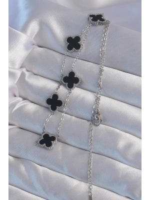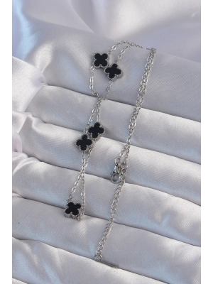 316l Çelik Gümüş Renk Siyah Mineli Yonca Kolye - Bamido