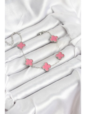 316l Çelik Gümüş Zincir Pembe Renk Yonca Bileklik - Bamido