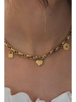 Çelik Gold Renk Kalın Zincir Model Kalp Figür Kadın Kolye - Bamido