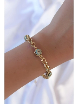 Pirinç Zincir Vip Seri Altın Renk Zirkon Taşlı Nazarlı Bileklik - Bamido