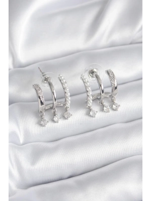 Bamido Pirinç Gümüş Renk Zirkon Taş Detay İncili Kadın Küpe - Lisinya