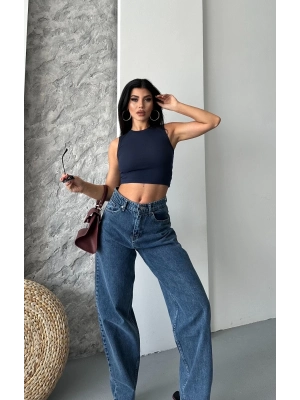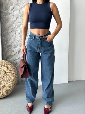 Mom Fit Bıyık Kar Yıkama Jeans Pantolon Koyu Mavi D2006