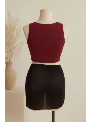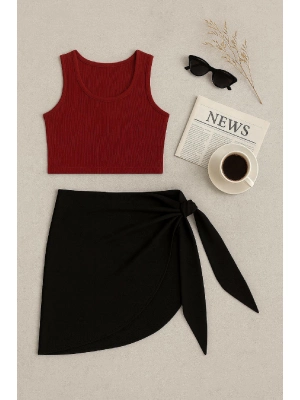 Kadın Bordo Yuvarlak Yaka Crop Ve Siyah Pareo 2'li Set