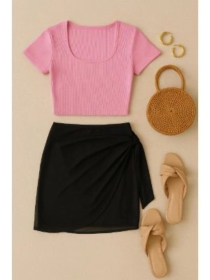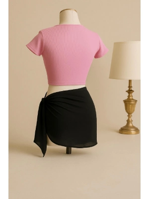 Kadın Pembe Yarım Kol Crop Ve Siyah Pareo 2'li Set